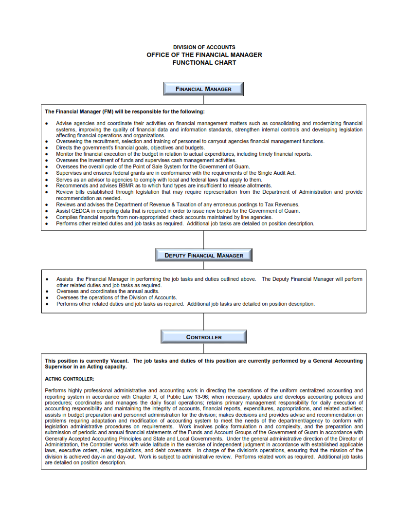 Responsibilities of this branch include but is not limited to: maintain daly cash collection/deposit activities, perform electronic transfers, issue/distribute Government of Guam checks.
