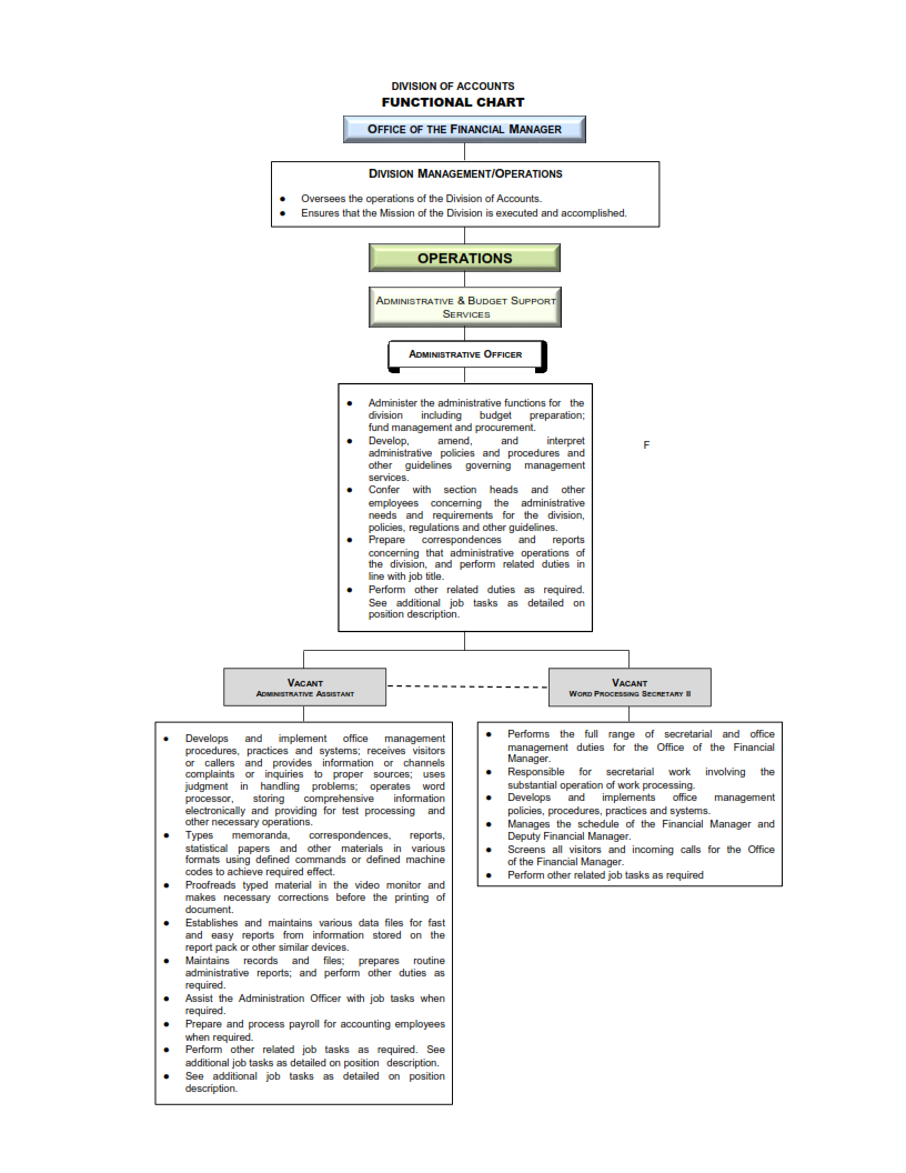Responsibilities of this branch include but is not limited to: processing payments, labor cost journal vouchers and preparation of financial reports.