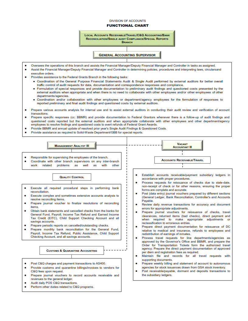 Responsibilities of this branch include but is not limited to: establishing/maintaining subsidiary receivable ledgers, process check reissuances, post journal vouchers, bank reconciliation, and process travel requests.